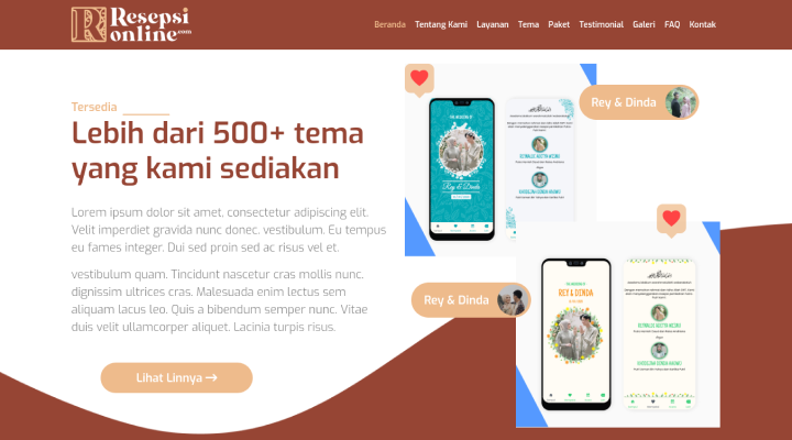 Resepsi online ada jasa yang menyediakan layanan resepsi secara online mulai dari streaming, undangan websita, video undangan, hingga nyumbang online, kali ini saya diparcayakan untuk membuat halaman tema dari layanan tersebuat, tampilanya bisa dilihat melalui link demo dibawah. atau yang penasaran dengan jasa penyedia layanan bisa pencet lihat langsung.